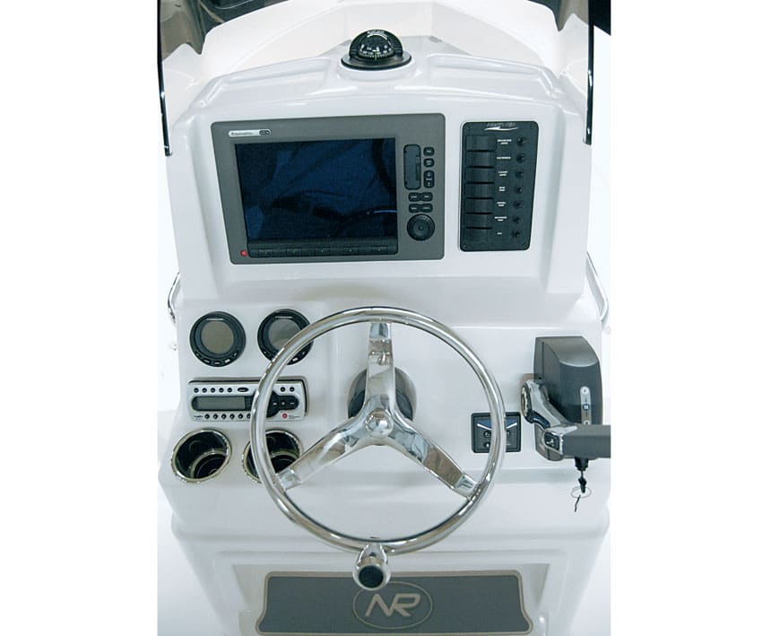 Running the boat through the insane, chaotic chop generated by hundreds of vessels of all sizes performing sea trials during the Miami International Boat Show truly taxes a boat’s abilities. The 200 hp Evinrude on our transom lifted us to plane virtually instantly, and we hit a top speed of 46 mph at 5,700 rpm while burning 18.6 gph. Optimum cruise was 32 mph at 4,000 rpm using 10 gph for a 288-mile range. The North Rip has a pair of Volvo Penta QL trim tabs, which proved very sensitive at all speeds. At cruising speed, the 21 turns tightly (tighter to port than starboard due to torque) and leans substantially into it. A Yamaha 150 is an available option.