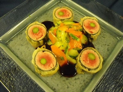 - Take a cold plate and place the cucumber/carrot salad in the center of the plate. Using your favorite sharp knife, slice the tempura tuna roll and then place as many pieces of the tuna around the salad. Odd pieces have a nicer eye appeal if you are working in a circular shape plate design.