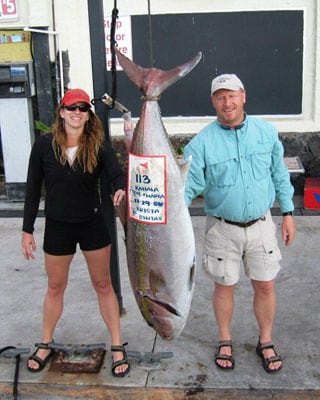 Of course, I cannot mention amberjacks without going back to December of 2006, when Marta, while drifting a live bait off Kona, got what she said was a fish and we guys insisted was a snag. We mocked her as she wrestled with what we presumed was a boulder, so imagine our surprise when it turned out to be a rather hefty amberjack, Marta’s largest fish ever.