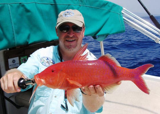 “You’ve caught this species before?” She asked. “But this one is still a world record? You mean I’ll have a second world record, on a fish that you do not have a world record?” There was none of her characteristic subtlety here. “A scorpionfish, huh? That has to STING.” (Why again do I love this woman?) Dale and Jack smiled. As I continued reeling, the Fish Gods raced to my defense. Thirty seconds after she landed her world record largehead scorpionfish, I too pulled a red, spiky lump over the rail – and my red, spiky lump was substantially bigger than her red, spiky lump. I quietly thanked the Fish Gods, as Marta’s claim to the IGFA book would be valid, but would also go on record as perhaps the shortest duration between setting and retiring a record – 30 seconds. She stared at me indignantly. I graciously did the celebration dance all over the back deck.