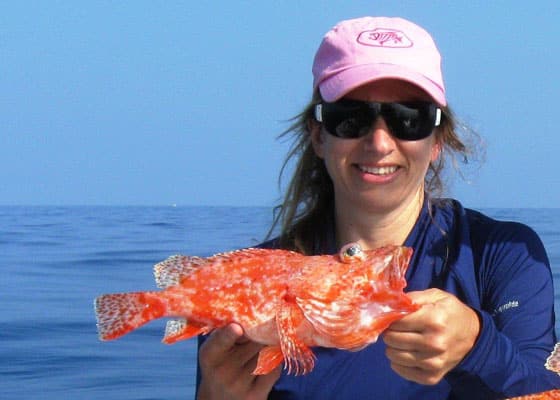A few minutes later, Marta pulled a red, spiky lump over the rail. She had caught a largehead scorpionfish, a deep water critter with qualities good and bad. Good – I had caught one before. Bad – it was an open world record. Marta’s fish made the cut – she had a second record. I continued reeling, mildly irked.