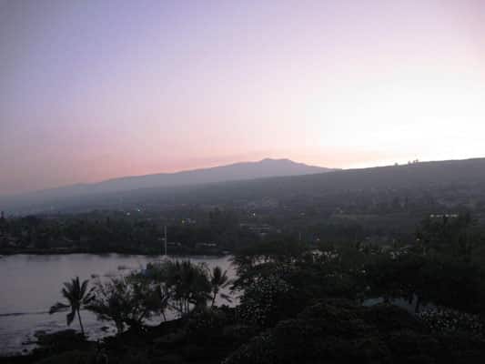 Mauna Kea looms out of the dawn mist. It is 14,ooo feet above sea level, and has snow on it much of the year. Marta has hiked it. I have gone fishing while she hiked it.