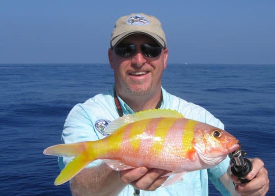 An oblique-banded snapper, one of the more beautiful creatures on the deep reefs.