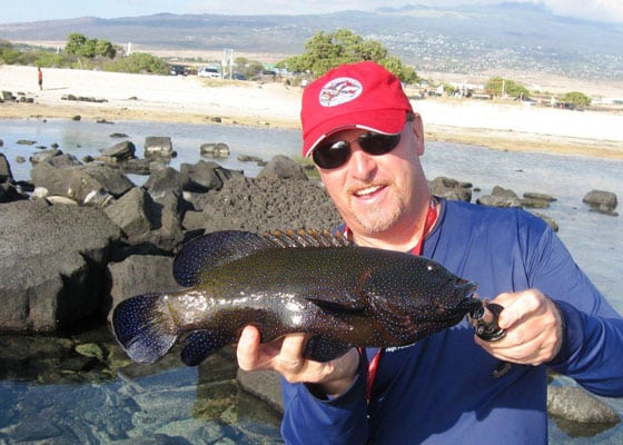 A peacock grouper. Note how shallow their habitat is. (This is not the record fish – those photos, self-taken, do not do justice to the colors or surroundings.)