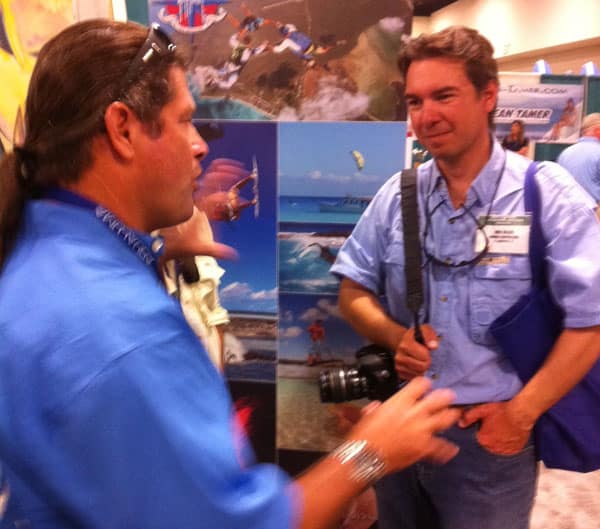 Places as well as things get play at the boat show. This year, I stopped at the Rum Cay booth with SF senior editor__ Mike Mazur, shown here talking to the resort’s Bobby Little (left). Rum Cay is now one of Guy Harvey’s outposts (guyharveyoutpostclubrumcay.com). Somehow Rum Cay had managed to slip beneath our radar screen; after realizing where it’s located — in the particularly fertile big-game grounds just southwest of San Salvador Cay — we’re already making plans for a visit! Check it out on Google Maps — and be sure to see it in the satellite view. Look at the huge upwelling areas along massive submarine ledges. Hear Bobby tell of losing a wahoo a solid eight feet in length…. Yeah, we’ve got to get over there!