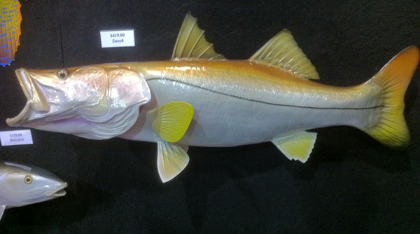 Another of my favorite drive-by booths as I walk the show at the Bahia Mar is always King Sailfish Mounts (kingsailfish.com). This year Ray Douglas and his henchmen have several new species including less glamorous fish such as a black drum (which in the talented hands of the King Sailfish team somehow comes out looking pretty damned cool). I took a shine to this large snook, with a different look than their other snook mounts.