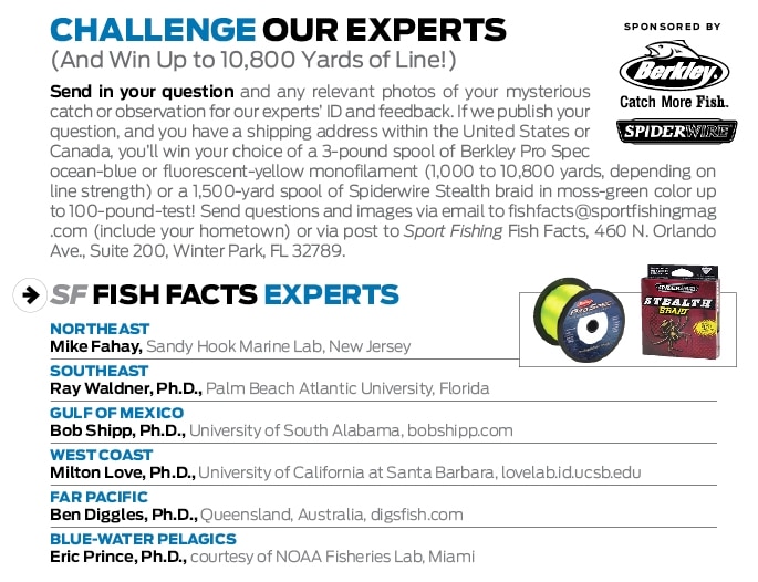 That is indeed a big pinfish, Lagodon rhomboides, Tim. As you noted, the pinfish is a popular baitfish; the species frequents sea-grass beds, mangrove roots and shallow-water reefs from Massachusetts and Bermuda through the Gulf of Mexico and to the Yucatan Peninsula. However, the pinfish — while present in Cuban waters — is absent from the Bahamas and the Antilles. A member of the porgy family (Sparidae), larger individuals make good table fare, but one has to be careful of swallowing bones. Pinfish can grow to around 16 inches in length (the IGFA world record is an astounding 3 pounds 5 ounces, caught off Mississippi), but most are much less than half this size. I’ve caught pinfish on jigs and small swimming plugs, so I’m not surprised you caught one on a spoon. They put up a dogged fight for fish of their stature.