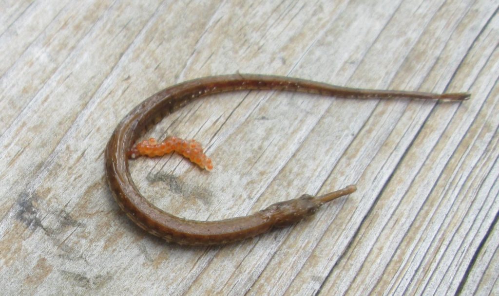 Traits distinguishing various species include snout length, number of body segments, and other even more subtle characters. Some are attractively colored. Pipefishes are first cousins to seahorses, and in fact are in the same family. They share the most peculiar habit of having the male brood the young after the eggs have been transferred from the female to a pouch on the male’s underside. And the young are born alive, exiting the pouch ready to swim and forage. As to whether you interrupted a mating activity, it’s hard to say. It’s possible that the apparent egg mass was in transit from female to male.