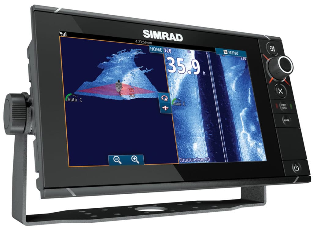 With StructureScan 3D, anglers can see fish, structure and bottom contours in high-resolution, 180-degree, three-dimensional clarity on Simrad NSS and NSO evo2 and Lowrance HDS Gen3 multifunction displays. The technology scans 600 feet to port and starboard and up to 300 feet in depth. Anglers can pan, tilt and rotate the display for optimal viewing. SelectScan automatically shades fish-holding zones and suspended targets in a contrasting color. The 3D Waypoint Overlay makes it easy to mark bait schools or structure. Available in December, StructureScan 3D employs a sonar module and Skimmer transducer and costs $999.