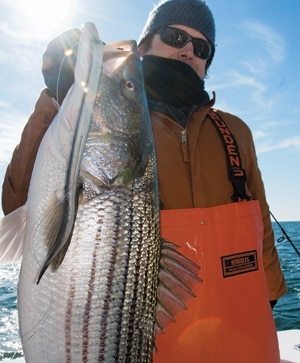 **While most fishermen jig, clam or troll for stripers during spring and fall migrations, Manzi chunks for them. “I do it a little differently than everybody else,” he says. “They chase the bunker schools, but I look for fish on structure, anchor up and chunk them when conditions are right.”