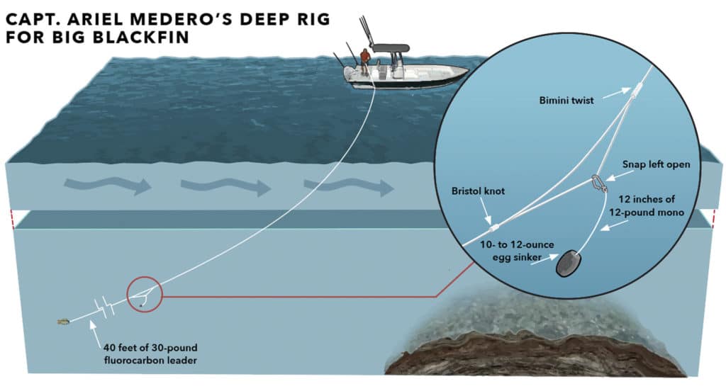 On the business end of rigs, Mullar (who cites the keen vision of big-eyed blackfin), Perez and Poveromo all like light fluorocarbon leaders (25- to 30-pound) with light-wire 1/0 to 3/0 circle hooks. Poveromo fishes 20-pound mono main line on Penn Fathom lever-drag reels, sizes 25 and 30, and emulates Marathon’s Capt. Ariel Medero, who ties 40 feet of 30-pound fluoro with a Bimini-twist/Bristol-knot connection.
