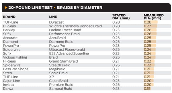 For braided lines also, the difference between stated and measured diameter differed less than I would have expected, especially considering that braids can be trickier to measure. In a few cases, diameter measured much less than stated.