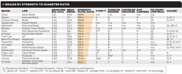 Here, you’ll see the results of tests and specific information gathered for each line — some of which are likely to prove a surprise — to help you optimize the dollars you spend buying line, which is often no small investment (see chart showing cost per yard).