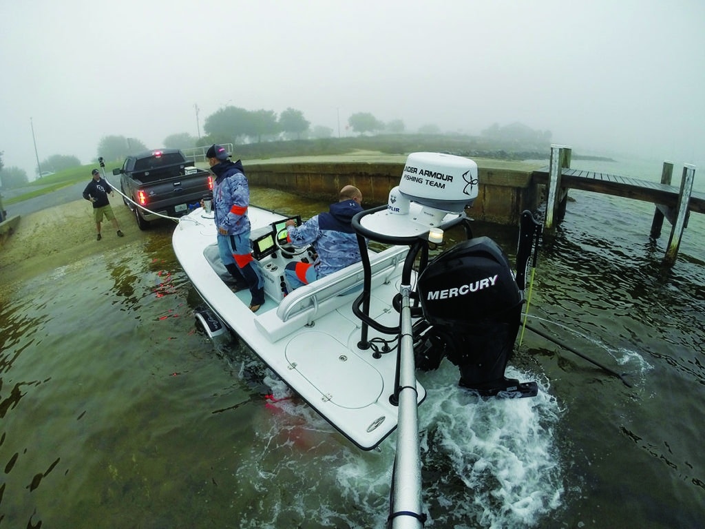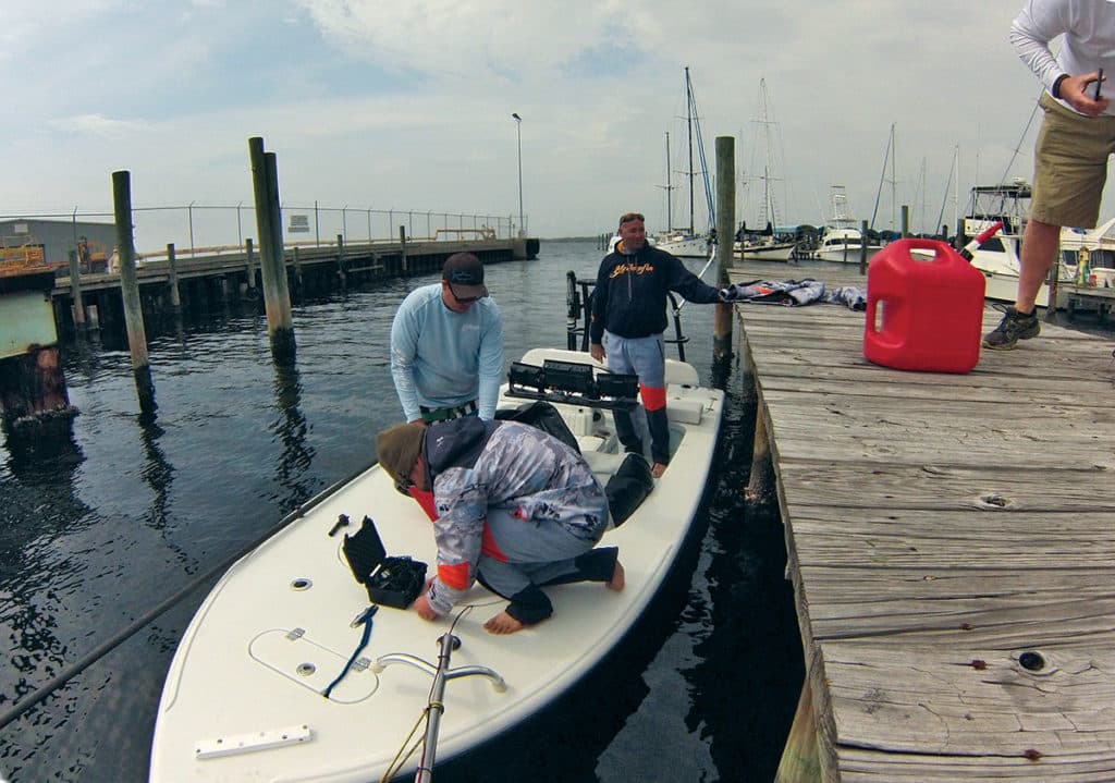 “We took the boat out and ran 20 miles to get our fuel economy and distance. The only thing we had on board was a gas gauge, no digital readout. We knew if we left the motor with the same prop, we could keep the boat under 5,000 rpm, and that would give us 5 to 5½ mpg, depending on the seas,” Daughtry says. “If we got off-course 20 miles, in a little boat with small fuel capacity, that’s a serious conversation.”